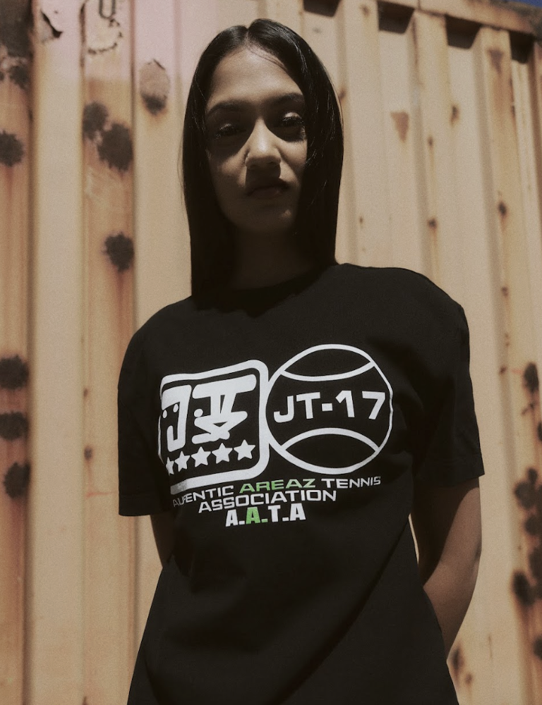 At its core, DA HEAVIEST HITTERZ fuses streetwear silhouettes with functional sportswear, grounded in Australian tennis culture. Standout pieces include the ‘Militant Shocs’ nylon tracksuit, technical tops and shorts, and a series of graphic tees linked to JUDAH’s own tongue-in-cheek tennis body, the A.A.T.A (Aufentic Areaz Tennis Association). An Agassi-referenced polo and shorts set rounds out the collection, reworked with a raw edge that flips the country-club uniform on its head.